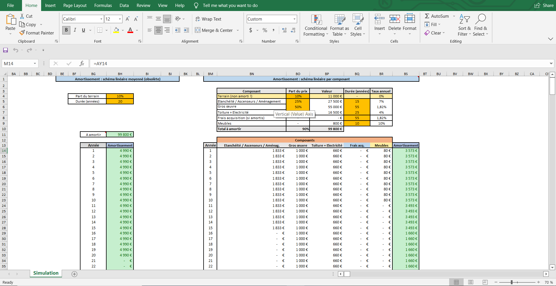 Avant d'être un simulateur en ligne, Simu-Immo a été créé sous la forme d'une feuille Excel interactive. Cette feuille permet de faire autant de simulations que vous voulez, même sans internet et les sauvegarder sur votre ordinateur. Les paramètres, quantités calculées, cas limites et exceptions du LMNP pris en compte sont les mêmes que sur le site, à l'exception de ce qui suit: